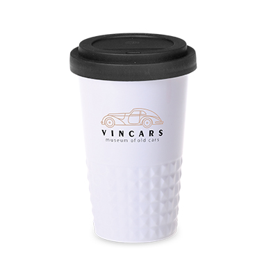 Raffiniertes Design durch symmetrisch-erhabene Form im unteren Bereich des Bechers. Doppelwandiges Porzellan mit perfekter Isolationsfunktion und dicht abschließendem Deckel.